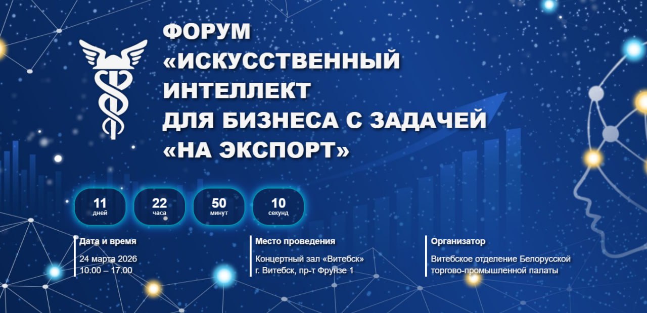24 марта 2026 года в г.Витебске состоится Международный форум «Искусственный интеллект для бизнеса с задачей «НА ЭКСПОРТ». Место проведения – Концертный зал «Витебск», пр-т Фрунзе, 1.